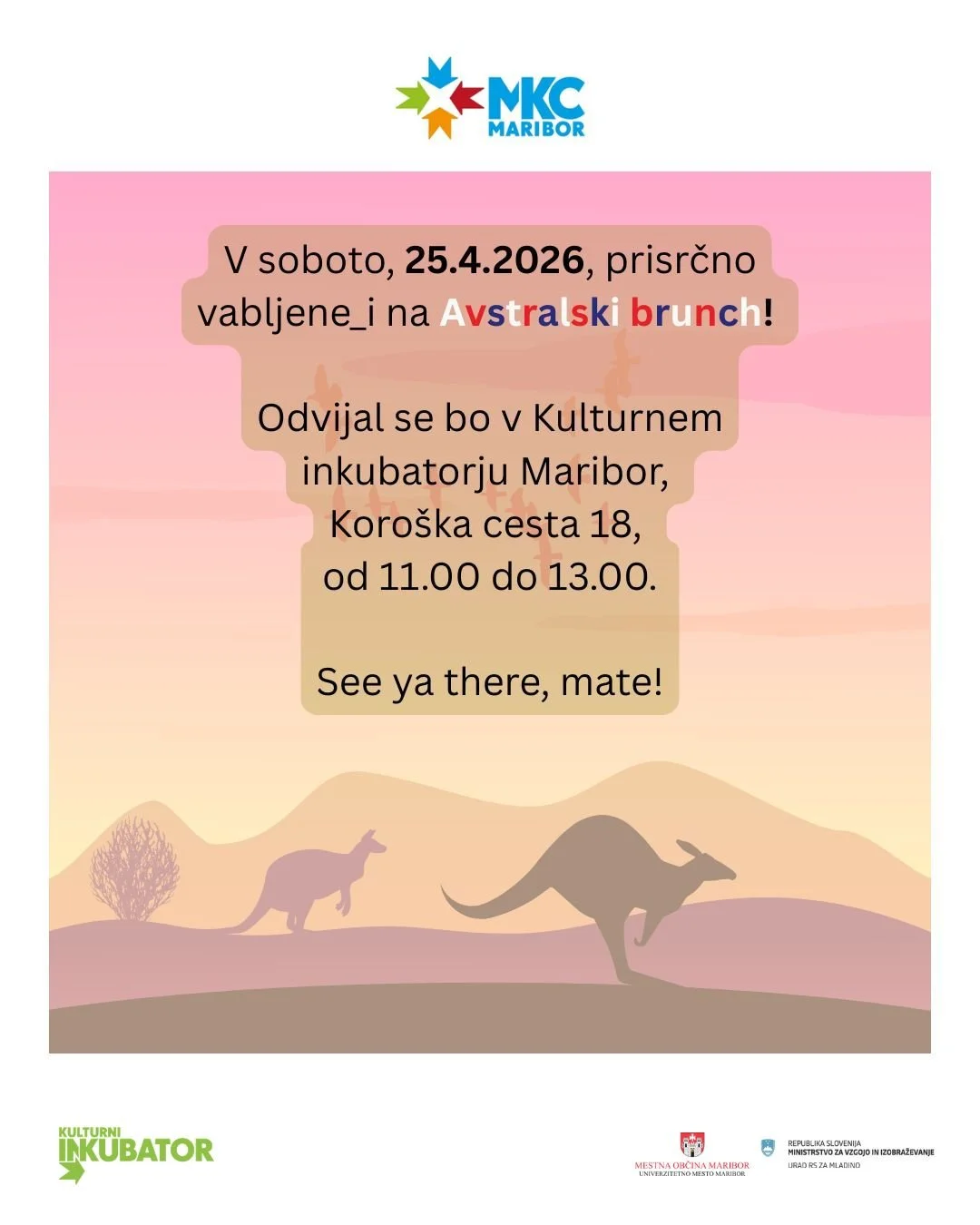 V soboto, 25. aprila 2026, se ponovno družimo na dogodku Brunch & Ritem. Brunch se v Kulturnem inkubatorju prične ob 11. uri in traja do 13. ure, v ospredju bo avstralska kulinarika. Dogodek je brezplačen, predhodne prijave so obvezne.