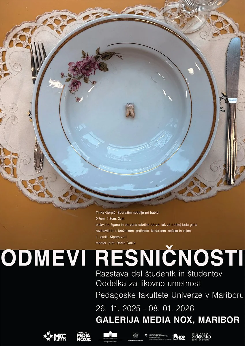 V sredo, 26. novembra 2025, bo v Galeriji Media Nox ob 18. uri odprtje razstave Odmevi resičnosti, pod katero so se podpisali študenti Pedagoške fakultete Univerze v Mariboru. Razstava bo v galeriji na ogled do vključno četrtka, 8. januarja 2026.