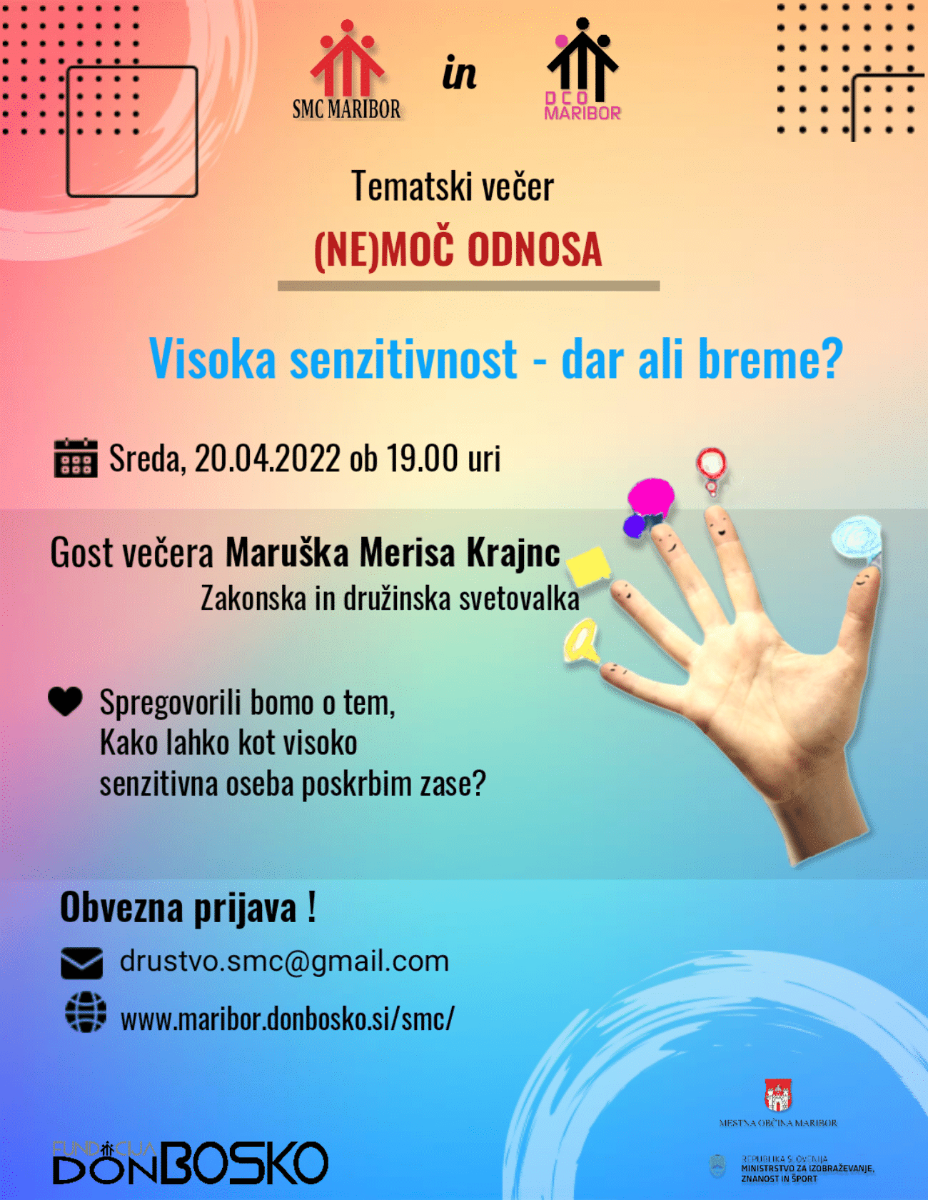 Vljudno vabljeni na tretji tematski večer (NE)MOČ ODNOSA, ki ga organizira Društvo Salezijanski mladinski center Maribor, v sodelovanju z Družinskim centrom Objem. Spletno predavanje bo v sredo, 20. aprila 2022 ob 19.00 uri. Gostja večera bo zakonska in družinska svetovalka Maruška Merisa Krajnc, ki bo spregovorila o tem, Kako lahko kot visoko senzitivna oseba poskrbim zase?