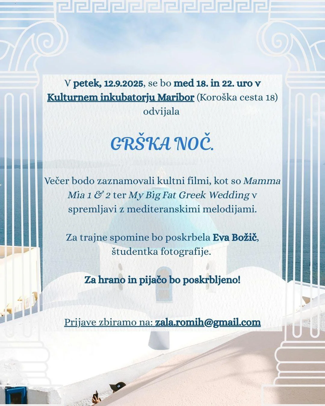Lani smo z družino dopustovali v Grčiji. Bilo je čudovito, res prelepa dežela, vredna ogleda. Ko smo se vrnili, sem se kar nekaj časa poigravala z idejo, da bi priredila dogodek z grško tematiko. Vem, da so podobne večere organizirali tudi v Klubu mariborskih študentov, vendar so bile v ospredju druge teme. Ko sem se maja udeležila dogodka »Poslikava tejglov« v organizaciji MKC Maribor, sem dodbila še dodatno motivacijo – in Eureka! Rodila se je Grška noč.